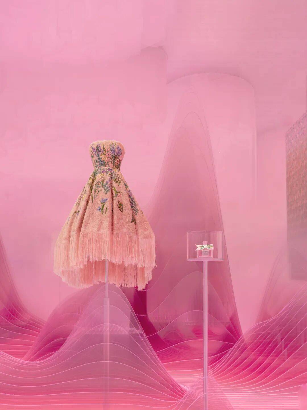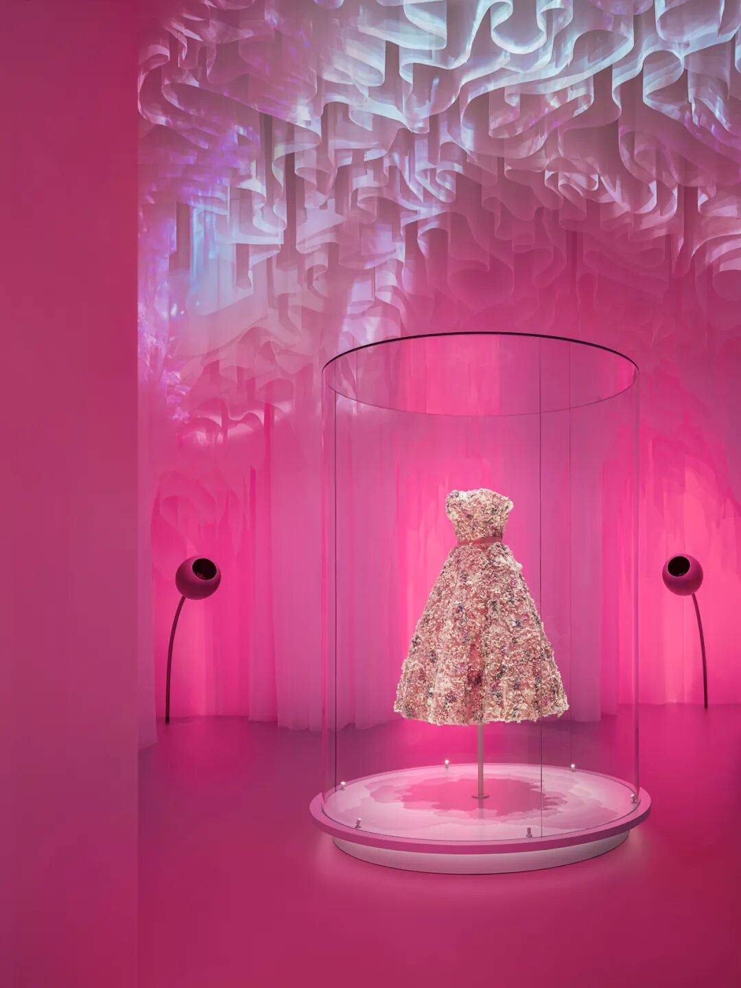 同一展区中,一众高级订制礼服悉数亮相,其中一款粉红色战士风格束胸礼服裙华丽夺目,该作品是为娜塔莉·波特曼(Natalie Portman)拍摄迪奥小姐馥郁香精最新广告大片量身订制,时尚与艺术相融共存,共同诠释迪奥小姐独立精神与摩登风格的多元面貌。